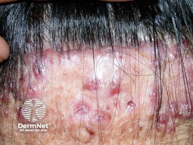 Folliculitis keloidalis nuchae is confined to the occipital scalp, and is mostly seen in dark-skinned individuals. Painful and unsightly acne-like papules and pustules are gradually replaced by extensive areas of scarring.