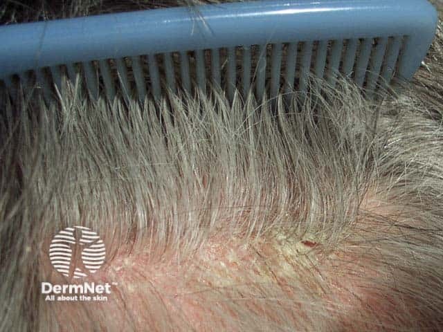 Seborrhoeic dermatitis results in patchy scaling, sometimes with itch and erythema. When inflammation is severe, it may cause localised temporary hair loss. However men afflicted by seborrhoeic dermatitis may falsely blame the dandruff for their pattern balding.