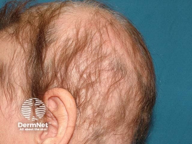 Diffuse hair loss from the scalp may present as an acute or subacute process without scarring, accompanied by shedding of telogen (bulb) or anagen (tapered) hairs, or more slowly as chronic thinning. In most cases, a careful history and examination reveals the cause. Where none is obvious, look for iron deficiency and thyroid disease.