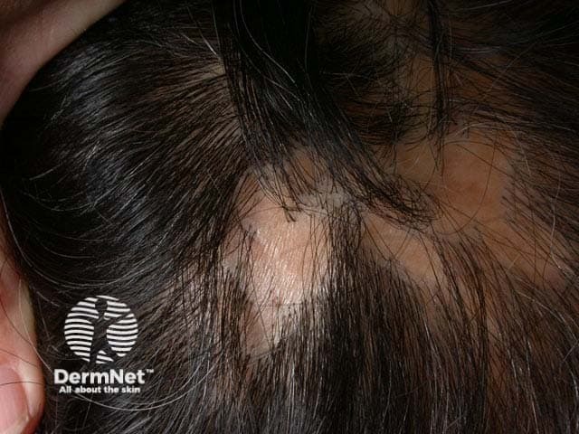 A patient may present reporting one or more bald areas. This may or may not be accompanied by an inflammatory process with varying degrees of irritation, soreness, erythema, scaling and pustules and can be followed by permanent scarring (cicatricial alopecia). If scaling is present, a scraping should be arranged for mycology. It is often helpful to obtain one or more scalp biopsies from the active inflammatory edge. Refer to a dermatologist for specific diagnosis and management.