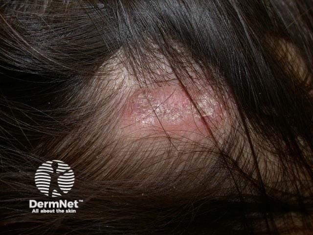Discoid lupus erythematosus is a more common explanation for symptomatic bald patches, characterised by diffuse erythema and scaling. There may be folliculocentric scaling and erythema peripherally, which may be difficult to distinguish clinically from lichen planus. Typical indurated red scaly plaques with scarring are frequently also present on the nose and cheeks.
