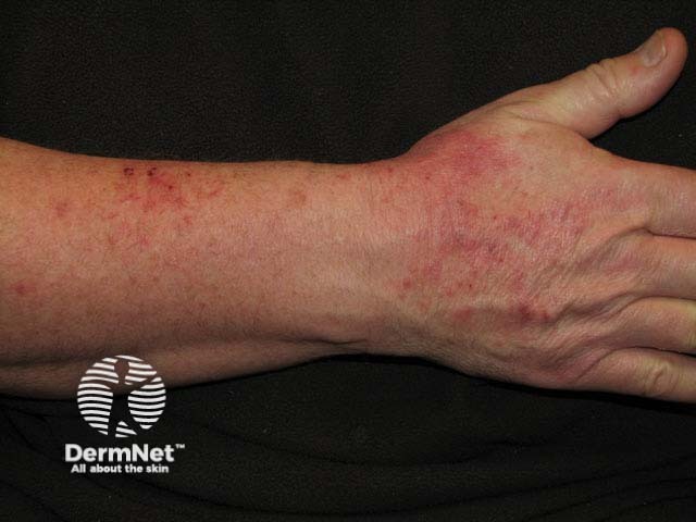 Acute contact irritant dermatitis presents with erythema, scaling, oedema, vesiculation and erosions. Chronic irritant dermatitis presents with erythema, lichenification, hyperkeratosis and fissuring. This may be very similar or indistinguishable from allergic contact dermatitis. However, irritant dermatitis tends to be confined to the site of injury, whereas an allergic reaction tends to spread.