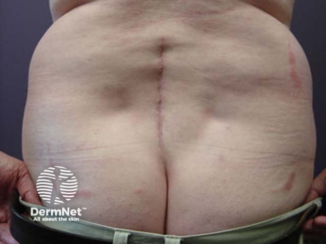 Postoperative dermatitis may be due to contact allergy or irritant reaction; the curious shape of the rash may give a clue as to cause, as in this case, when it was due to adhesive tape. Mild to moderate irritant reactions may be asymptomatic.