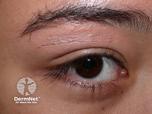 The young lady illustrated has applied makeup to disguise dermatitis on her eyelid. This arose a few hours after she waxed some stray hairs. It occurred because she was taking isotretinoin, which makes the skin more sensitive than usual.