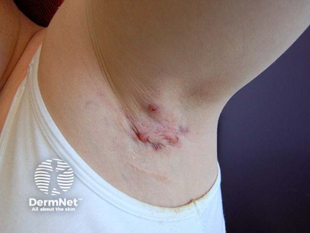 In contrast to furunculosis, hidradenitis suppurativa is a chronic skin disorder that affects one or more apocrine gland areas, particularly the axillae and anogenital areas. The follicular infundibula become occluded and then rupture, resulting in painful inflammatory nodules, sterile abscesses, draining sinus tracts and scarring.