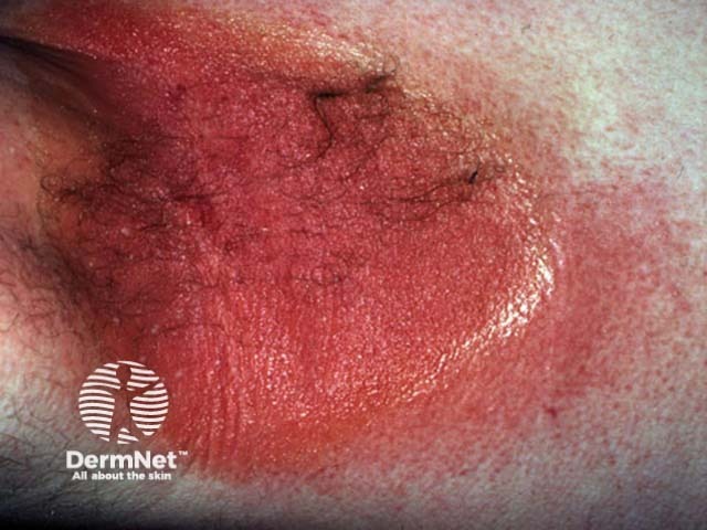 Irritant contact dermatitis is much more common than allergic contact dermatitis; likely irritants include aluminium salts in antiperspirants, perspiration, tight clothing and woollen garments.