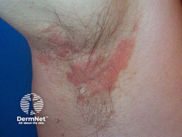 Seborrhoeic dermatitis is generally present in the scalp, hairline, eyebrows and/or nasal creases when it arises in the axillae. Ill-defined, thin and irregular, salmon pink plaques are asymptomatic or mildly irritating.