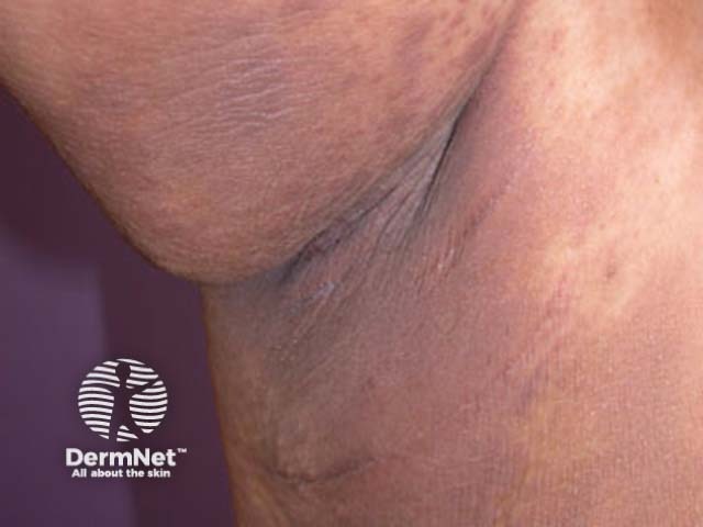 Atopic dermatitis most often affects the antecubital and popliteal fossae. It also very commonly involves the axillae, but generally spares the vault, tending to affect the posterior aspect where clothing rubs. The patient illustrated has lichenified plaques in the axillae, which are ill-defined and hyperpigmented. She complained of severe pruritus and was almost erythrodermic from chronic, severe, generalised atopic dermatitis.