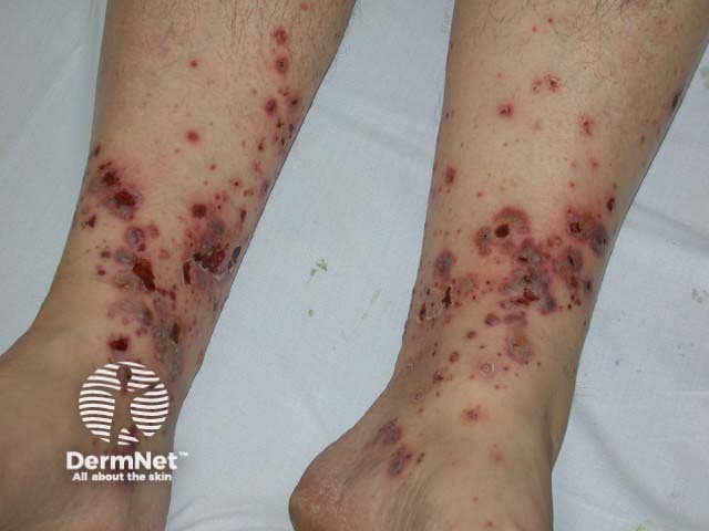 The skin eruption settles slowly over some weeks but may recur over a period of months, depending on the underlying cause. Some residual haemosiderin staining is common. This patient had minor scarring at sites of previous ulceration.