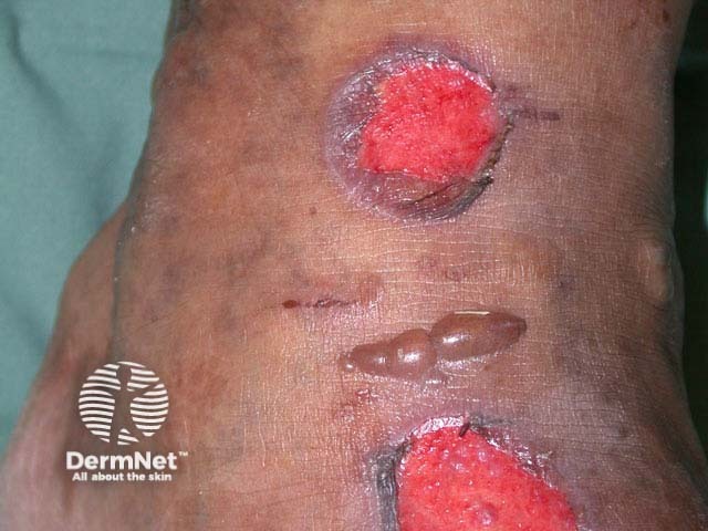 This is a primary bullous eruption, and the precise diagnosis cannot be made from the images. The differential diagnosis includes thermal injury, bullous drug eruption and bullous pemphigoid. In this case the blistering appeared to have been provoked by the prescription of frusemide to a diabetic with chronic renal failure. An irregular shape is characteristic of diabetic bullae.