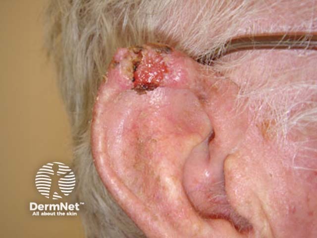 SCC presents as an enlarging tender nodule, with varying amount of scale depending on how well differentiated it is. It usually arises within actinic keratosis or SCC in situ. Large size and ulceration are poor prognostic features; lesions on the ear are prone to metastasise.