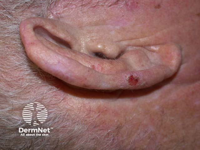 Basal cell carcinoma (BCC) grows slowly and most often presents on the ear because of bleeding or ulceration, as they are otherwise asymptomatic. Careful examination under magnification reveals a shiny nodule or plaque and arborising telangiectasia. Superficial BCC resembles SCC in-situ but the shine and telangiectasia can often be observed on stretching the affected skin.