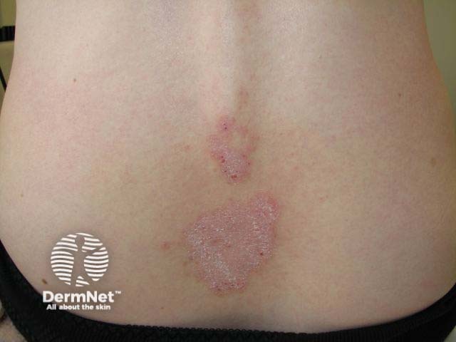 Lichen sclerosus results in asymptomatic or itchy, well-demarcated, white, dry plaques on the trunk. It affects the vulva in about 90% of cases; 15% have extragenital disease, as in the case illustrated. Ultrapotent topical steroids are required; diagnosis and management is best undertaken by a dermatologist.