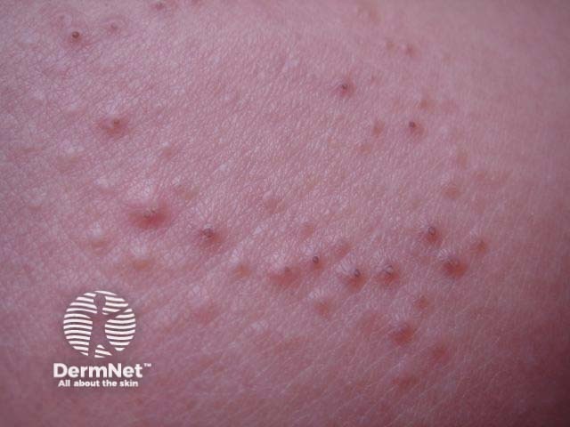 Lichen spinulosus presents as a round or annular cluster, or clusters, of asymptomatic follicular papules on the trunk or limbs of children or adults. Close inspection reveals spiny keratinous plugs within each follicle. It resolves spontaneously within a year or two.