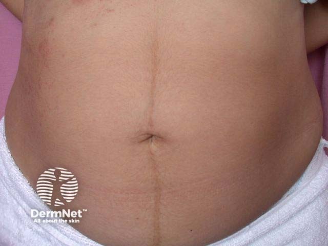 The dark line down the centre of a pregnant abdomen is called linea nigra, in contrast to the less-obvious non-pregnant linea alba. The pigmentation change may be due to increased levels of melanocyte stimulating hormone, oestrogen and progesterone during pregnancy, which may also result in darkening of the nipples, axillae and perineum and face (melasma). Although linea nigra may be normal for a non-pregnant sun-exposed dark-skinned individual, recent pigmentary change might be a sign of Nelson syndrome (ACTH-secreting pituitary tumour).