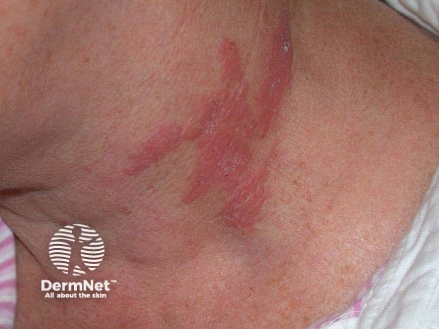 If a patient presents with an acute itchy, swollen or blistered, erythematous rash, it’s likely to be due to contact allergy. The differential diagnosis includes herpes zoster, but this should be confined to a dermatome and is painful. Contact dermatitis may look rather odd –unusual–shaped plaques, asymmetrical distribution, and usually confined to exposed areas. Linear plaques are almost pathognomonic of plant contact allergy, which is frequently a reaction to toxicodendron (the rhus tree, as in this case). However, there are many other plants that may less commonly cause contact allergy in susceptible individuals.