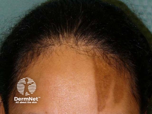 Localised scleroderma (morphoea) has a rare variant, linear scleroderma. It’s believed to be an autoimmune disease where an extracellular matrix protein is the likely antigen. The reason for linear lesions is not understood. It is known as coup de sabre when found on the scalp, and this usually affects children or young adults. Firm or hard linear permanent indentations may affect skin, subcutaneous tissue, underlying muscle and bone.