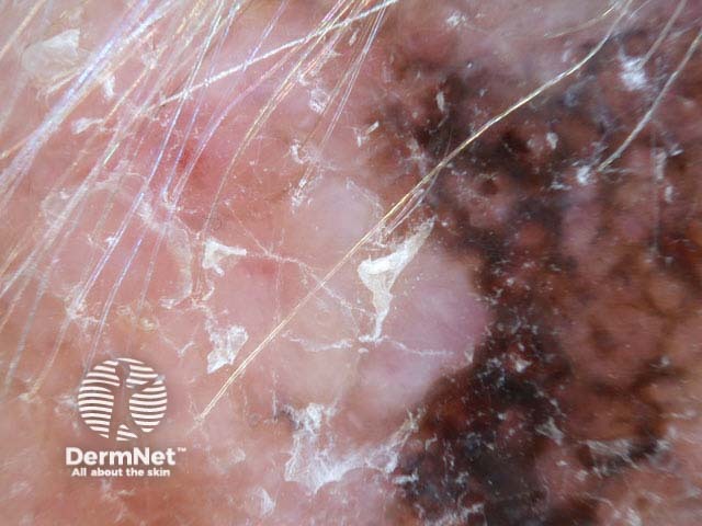 Only part of the lesion is viewed by dermoscopy. The left half reveals scale overlying white and pink irregular amorphous areas, The right side is composed of dark irregular rhomboid structures with thick lines and irregular holes. There are some irregular clusters of greyish dots.