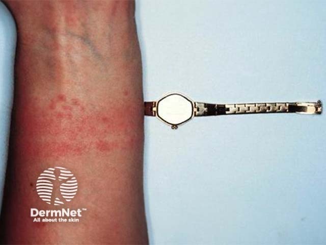 Patch tests to confirm diagnosis (refer to a dermatologist). Not all reactions to watch straps are due to contact allergy to nickel. Sometimes there are other contact allergies, particularly to cobalt. Other causes include irritation from rubbing, sweat, detergents etc. Perform diethyl glyoxime/ammonium hydroxide test on metal contactants to determine whether their use is suitable for the patient.