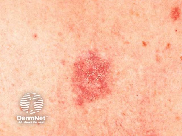 Treatment depends on the expertise of the practitioner. Referral to a dermatologist is recommended. A special technique of cryotherapy using spray apparatus is suitable, curettage and electrosurgery an alternative. The lesion is too large to excise with primary closure.