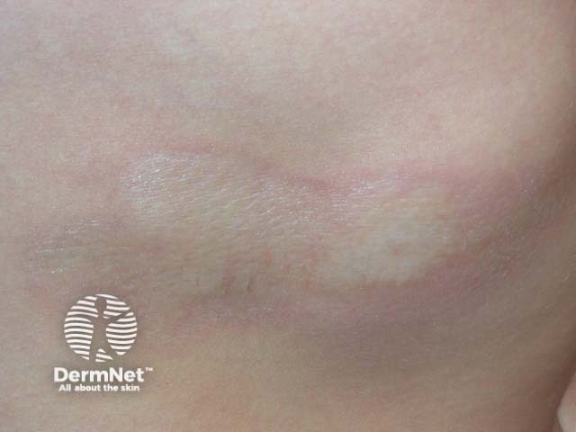 Plaque-type morphoea is characterised by single or few oval indurated plaques one to thirty centimeters in diameter. Initially there is a pink or violaceous macule, which later becomes smooth, ivory white and hairless in the centre. After some months or more often years, the plaque softens leaving an atrophic white or hyperpigmented area.