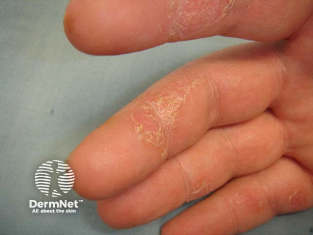 In general, psoriasis affecting the palms should be protected from frictional injury, lubricated and soothed with emollients. Hand creams should be thick, and a thin amount should be applied frequently to reduce fissuring. They are not permitted in certain jobs (e.g. car painters), when they should be used liberally after hours. No specific protection from chemical irritants or water is required.