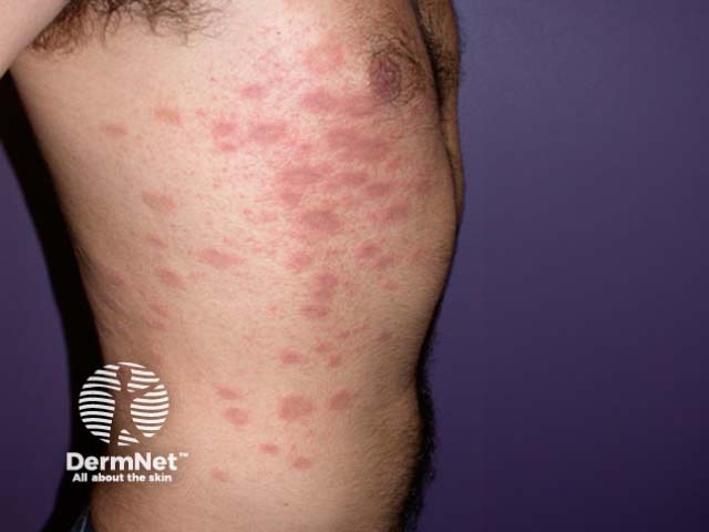Most patients with pityriasis rosea are between 10 and 35 years, and it is more common in females. Typically the first sign is a solitary oval pink patch with a collarette of fine scale just inside the border. This is the herald patch and occurs in about 50% of patients. Many more similar patches appear within the next few days or up to several weeks. These tend to be smaller and are generally symmetrically distributed and predominantly on the trunk, following a so-called fir-tree distribution. Occasionally lesions are unilateral, localised to a certain area or distal in distribution. Oral lesions occur in 10 to 15% of cases. Papules, plaques, purpura and vesicles may occur. Itch may be absent (25%), mild, moderate or severe.