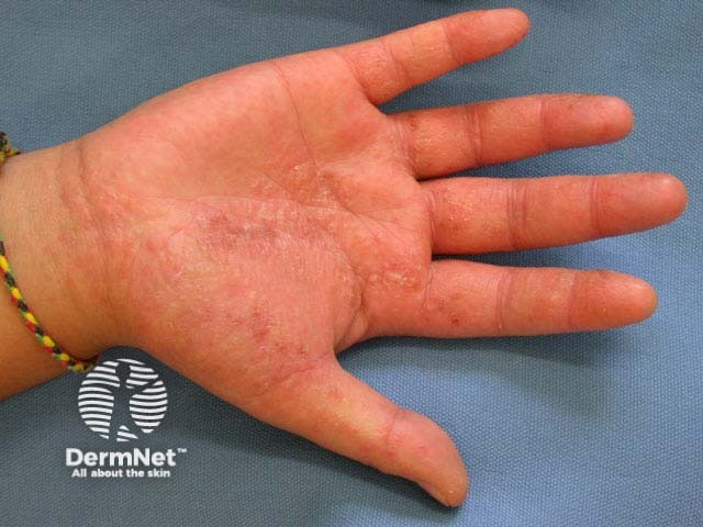 Pain, pustules or crusting suggest secondary infection with Staphylococcus aureus and/or beta haemolytic Streptococcus, common in pompholyx and absent in pustular psoriasis despite the pustules. Swabs may be appropriate to confirm the presence of bacterial infection and select appropriate antibiotic therapy.