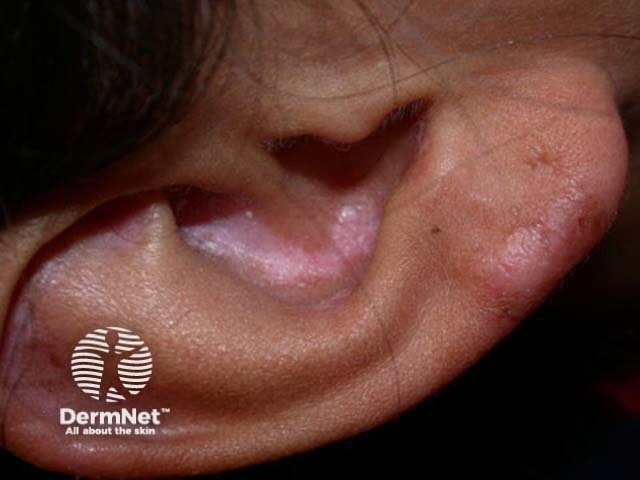 All varieties of cutaneous lupus erythematosus (LE) are more common in females than in males, and they are more common in darker skin types. Discoid LE is the most common presentation and results in persistent red scaling plaques on light-exposed areas especially the nose, cheeks, lips, ears and scalp. The plaques heal with scarring.