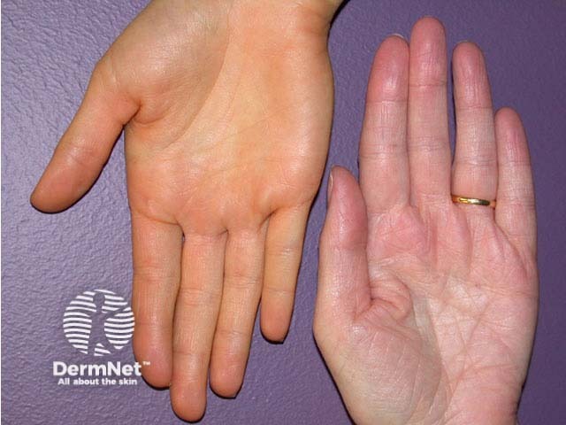 The palm on the left is orange-coloured (xanthochromia). In this case it is due to carotenaemia. The abnormal colour is most easily observed in those with fair skin, particularly where the stratum corneum is thickened on the palms and soles or where there is excessive subcutaneous fat.
