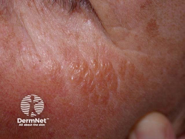 She has multiple, dome-shaped, amber-coloured papules coalescing into a plaque over the lateral zygoma.