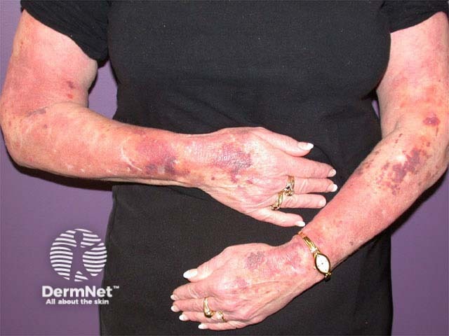She has been applying potent or ultrapotent topical steroids for months or years (in this case, betamethasone valerate). Signs of steroid atrophy may include skin transparency, striae, telangiectasia, skin fragility & jagged scars. Senile or 'solar' purpura arises because red cells leak into the dermis after rubbing a persistent pruritic dermatosis (in her case, atopic dermatitis). It is especially likely on sun-exposed sites, already thinned by ultraviolet radiation.