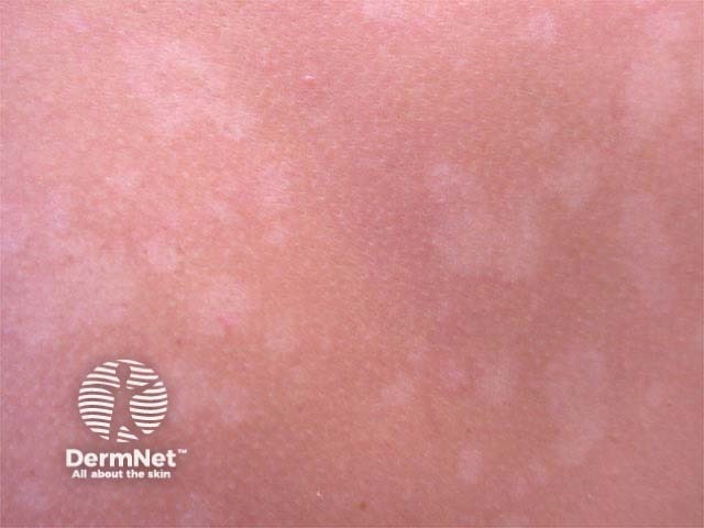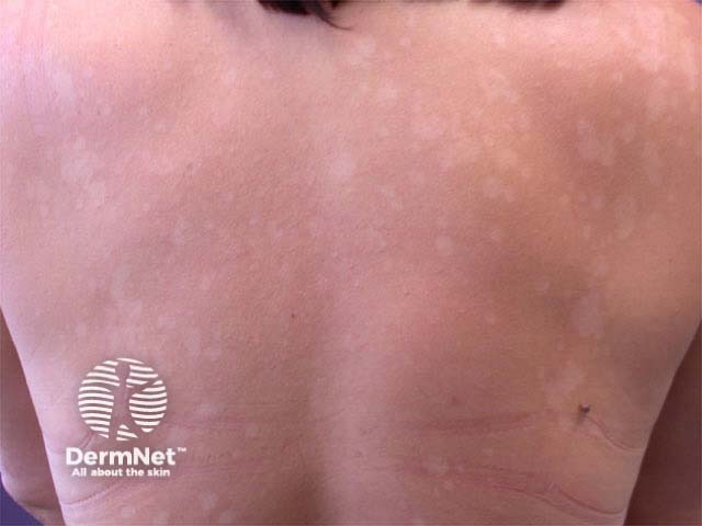 The patient presents with numerous, slightly scaly hypopigmented patches on her trunk and proximal upper limbs, characteristic of pityriasis versicolor (sometimes incorrectly called tinea versicolor), a yeast infection. Previously classified as M. furfur, there are seven lipophilic species of Malassezia, which are normal human saprophytic yeasts but may become pathogenic in their mycelial form. Pityriasis versicolor is most often due to M. globosa. It results in mild inflammation (pink) and hyper- (brown) or hypo- (white) pigmentation with a bran-like scale.