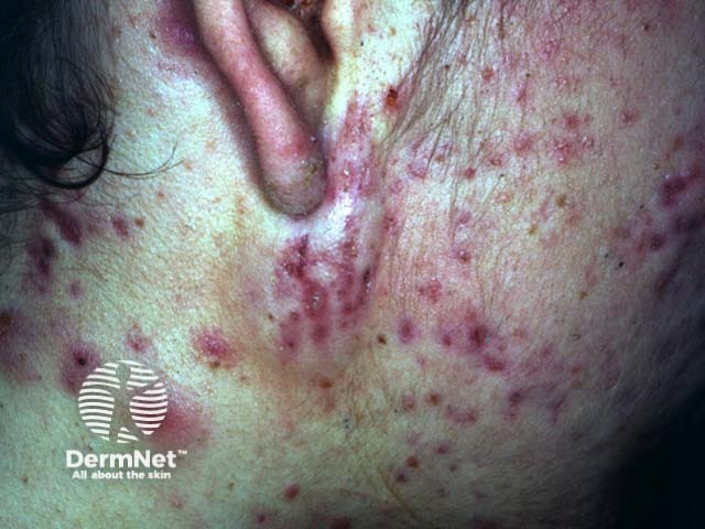 This young man has severe nodulocystic acne. It is resulting in pain, unsightliness and scarring. Prompt effective treatment is required. He should be referred to a dermatologist. While waiting for the appointment, initial treatment should be with oral tetracycline 1g/day or one of its derivatives (minocycline or doxycycline at least 100mg/day) and continuation of topical benzoyl peroxide. Antidepressant medication should be considered if there is significant mood disturbance. The most effective treatment of nodulocystic acne is oral isotretinoin at a dose of 0.5 to 1 mg/kg/day for five or six months (occasionally longer). Isotretinoin is often curative. It is subsidised only when prescribed by a vocationally registered dermatologist. The dermatologist will review the patient regularly to monitor and manage inevitable side effects. These include mucocutaneous dryness, staphylococcal infections, tiredness, myalgia and hyperlipidaemia. Isotretinoin is a teratogen so must not be taken in pregnancy. Some patients treated with isotretinoin suffer from depression so multidisciplinary care may be appropriate. Some patients with severe nodulocystic acne will also receive oral erythromycin for a month or two - tetracycline is contraindicated when isotretinoin is prescribed because of an increased risk of raised intracranial pressure. Oral vitamin-A is contraindicated for the same reason.