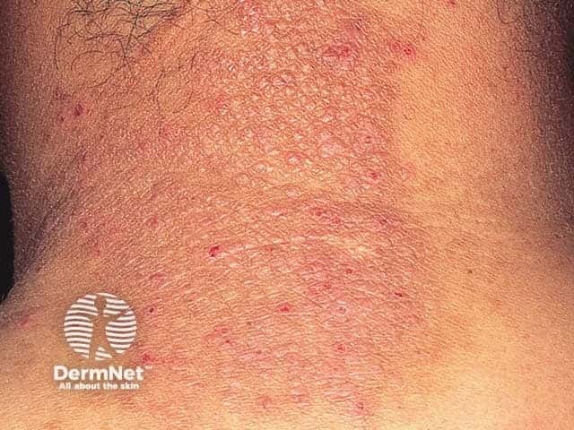 Most patients present with lichen simplex when it has been present for many months or years. As it is a form of eczematous dermatitis, it is treated with potent or ultrapotent topical steroids, but frequently occlusion or intralesional injection is required for a quick response. The aim is to thin the affected skin down to a normal texture and to stop the itching. However, the patient must also want to stop scratching, which may be an intractable habit. Lichen simplex will not resolve if scratching continues. Other antipruritic measures may help, including dabbing with a cold moist cloth, tar preparations and oral antihistamines. Consider contact allergy in resistant or recurrent disease. Lichen simplex on the neck may appear identical to dermatitis caused by contact with nickel jewellery.