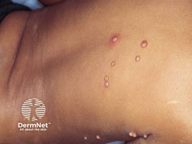This is molluscum contagiosum, a common benign skin infection caused by a pox virus. Individual lesions are umbilicated skin-coloured papules 2 to 5 mm in diameter with a soft white core. The lesions favour the flexures and are frequently surrounded by eczema (dry red itchy skin), even in non-atopics. Immunosuppressed children and adults often develop particularly extensive infections.