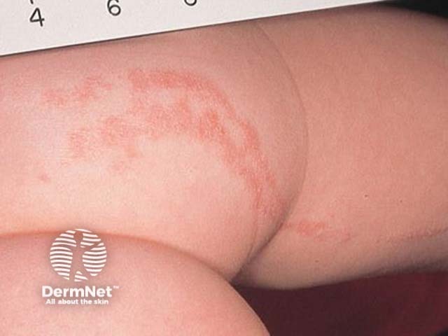 Linear lesions may be congenital, the result of scratching (isomorphic response or Koebnerisation), due to contact with material which has streaked on the skin, or arise for unknown reasons.Linear naevi include: