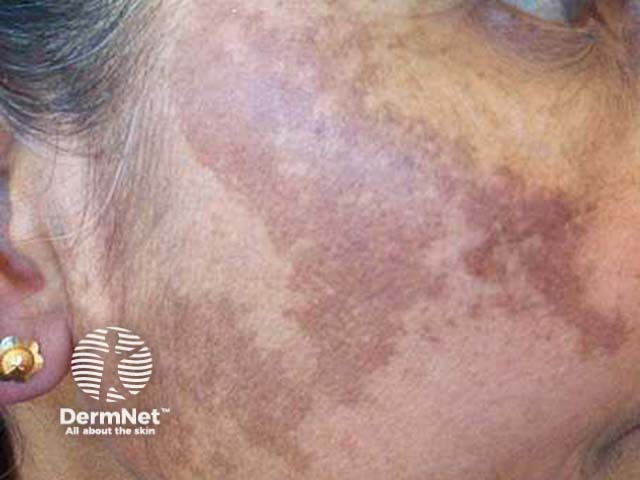 This is melasma (chloasma), a common condition characterized by brownish macules on cheeks, forehead, upper lip, nose and chin. It is more common in females, and although often observed during pregnancy and on the oral contraceptive pill it may occur independently in older women.