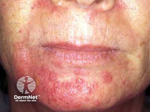 This is perioral dermatitis affecting paranasal skin and chin ("muzzle rash"). There are asymmetrical clusters of slightly scaly papules on an erythematous base. The skin immediately adjacent to the vermilion of the lip is relatively spared.