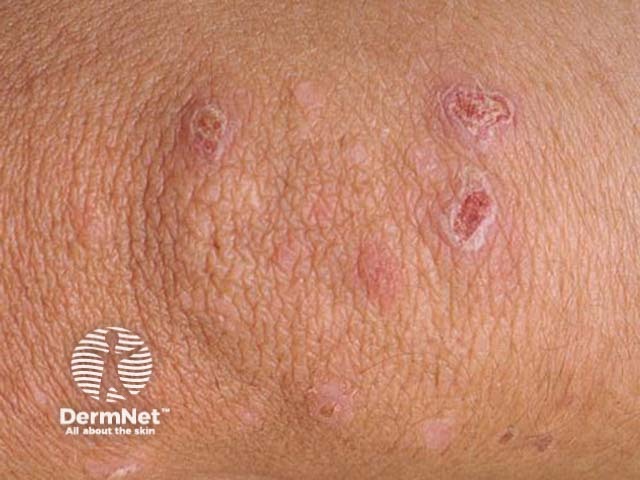 The patient has dermatitis herpetiformis, characterised by groups of vesicles on the extensor aspects of the skin and marked pruritus.