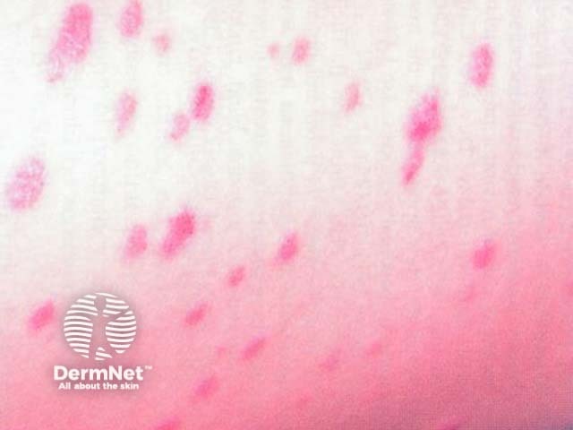 Acute guttate psoriasis. An antecedent streptococcal infection is frequently the precipitating cause. This form of psoriasis characteristically presents acutely, with numerous mildly pruritic or asymptomatic small "teardrop" papules and plaques. Scale is not as prominent as in chronic plaque psoriasis. There may be a history of preceding chronic plaque psoriasis. A drug eruption should be considered in the differential diagnosis, but penicillin rashes are characteristically morbilliform.