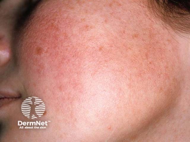 This is facial keratosis pilaris, which is given various names depending on the appearance and subsequent atrophy. These include keratosis pilaris atrophicans faciei, ulerythema oophyrogenes (when eyebrows are affected), and atrophoderma vermiculata (when honeycomb scarring arises).