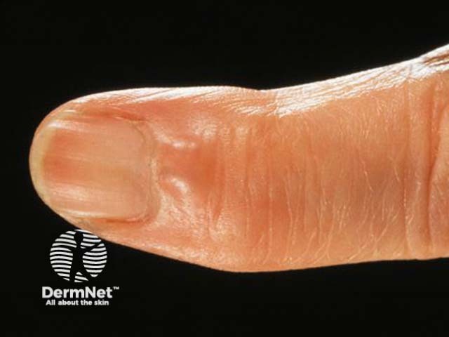 Myxoid cyst. This is a soft skin coloured or translucent nodule, which grows on the terminal phalanx and fluctuates in size. It causes a longitudinal furrow of the nail plate.