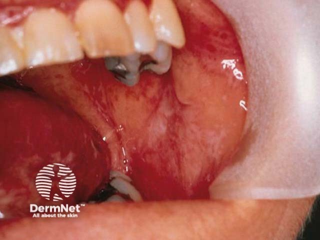 This is oral lichen planus. Note a reticulate pattern of white lines on the buccal mucosa and the lateral side of the tongue.