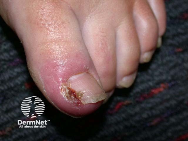 In-growing left great toenail, paronychial erythema and swelling with crusting and granulation tissue.
