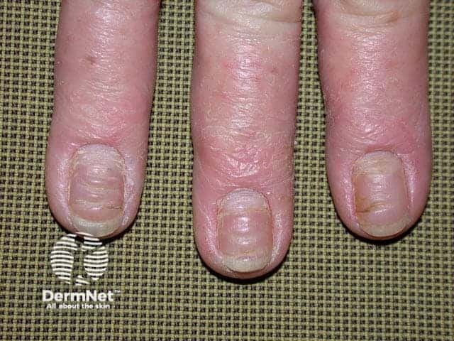 Irregular transverse ridging affecting three finger nails, with adjacent mild proximal and lateral paronychia.