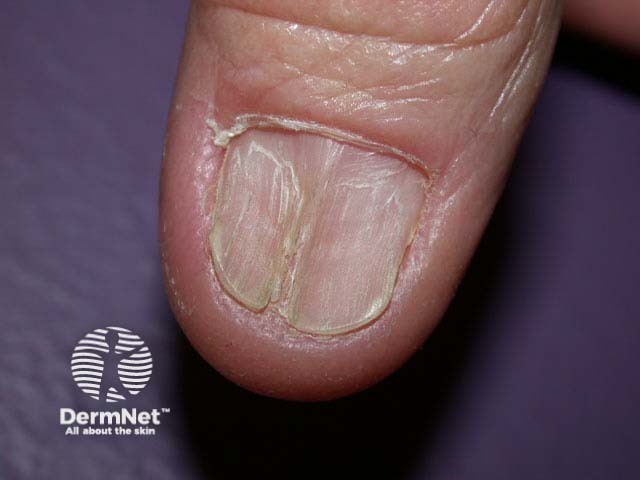 A central longitudinal ridge with distal nail plate splitting and thinned concave nail plate on either side. Elevation of the proximal nail indicates early pterygium formation.