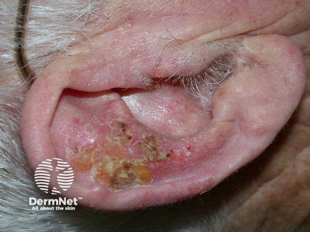 Treatment of choice for squamous cell carcinoma on the ear may be photodynamic therapy, but such lesions are commonly managed by cryotherapy, 5-fluorouracil cream, imiquimod cream and surgery.