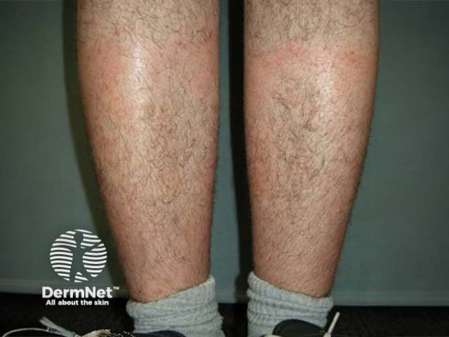 Dermatitis on lower legs due to gumboots; mercaptobenzothiazole contact allergy.