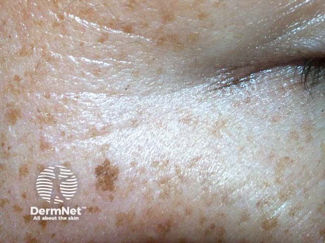 The ephelis (pl. ephelides) presents as a 1-5mm tan macule that shows up with sun exposure and tends to fade in winter. Histologically the pigment is found within keratinocytes because of increased localised production of melanin by genetically programmed melanocytes. Ephelides are particularly common in fair-skinned and red-haired individuals during childhood and adolescence, and appear mainly on the nose, cheeks, shoulders and upper back. They tend to fade during the winter months and with age. Sunscreens may prevent their appearance.